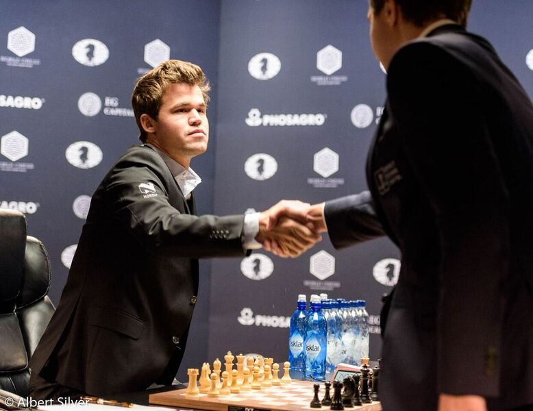 - 19h59 – Partie 10 – Magnus Carlsen et Sergey Karjakin se serrent la main (Photo (c) Albert Silver)