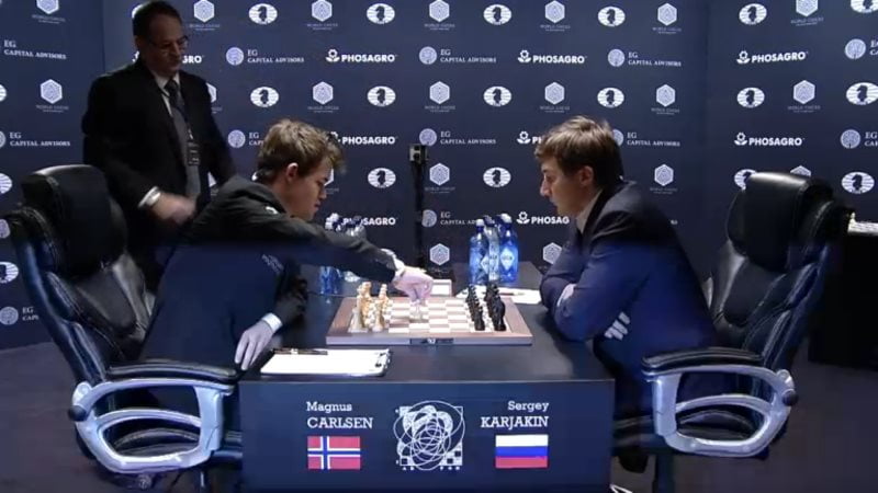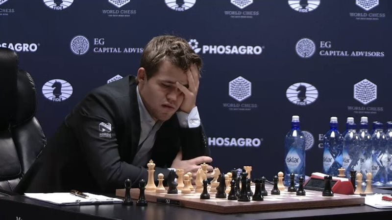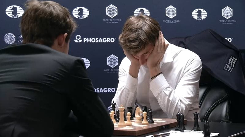 Here’s something the engine evaluations won’t tell you: a mix of tiredness and worries around Carlsen’s 51.f3. #CarlsenKarjakin pic.twitter.com/xkmTLGBrao